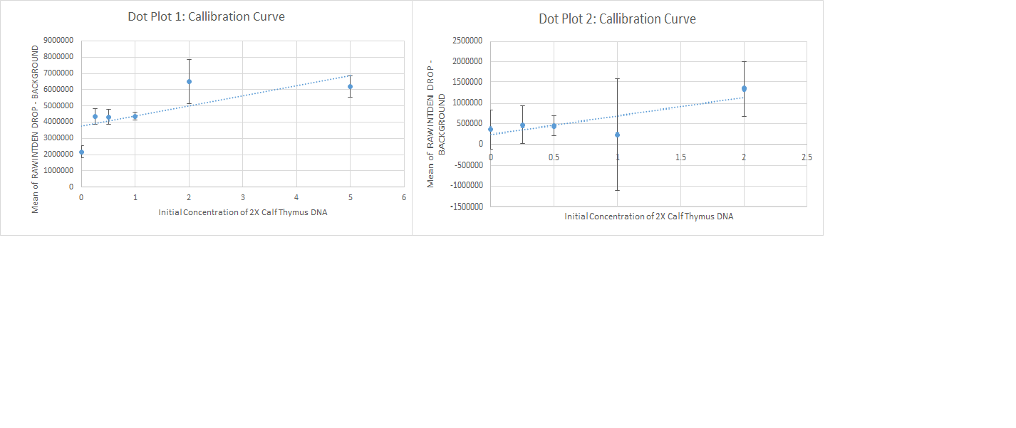 | Initial Concentration of 2X Calf Thymus DNA solution (micrograms/mL) | Final DNA concentration in SYBR Green I solution (µg/mL) | Sample Number | RAWINTDEN DROP - BACKGROUND: Image 1 | RAWINTDEN DROP - BACKGROUND: Image 2 | RAWINTDEN DROP - BACKGROUND: Image 3 | Mean | Standard Deviation |