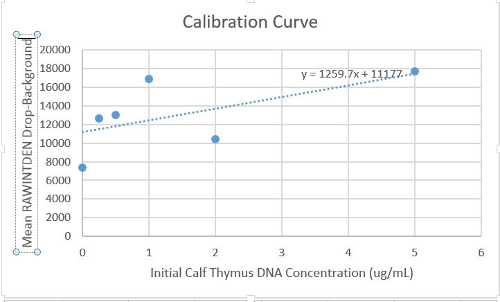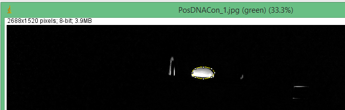 Step one, set the micropipettor to 80 microliters  Step two, extract 80 microliters of the SYBR Green and place onto the slide in the fluorimeter Step three, Get a new tip, then extract 80 microliters of the DNA and place on the same drop of the SYBR Green Step four, Place phone in a proper angle in front of the fluorimeter and take a picture with the box cover closed over it Step five, take three pictures of each DNA sample  Step six, clean up the sample on the slide and dispose of the tip and sample, then move the slide in the fluorimeter to a new positions Step seven, repeat steps listed above for each of the different DNA samples