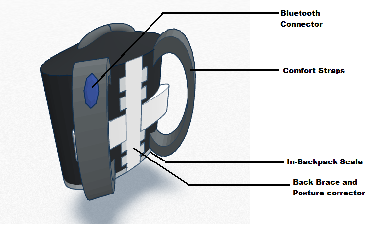 Need: When combined, the weight of the text books, binders, papers, and folders that full-time students carry in their backpacks is substantial. Oftentimes, a student who wears a backpack will carry their entire supply inventory by necessity, as lockers sometimes aren't readily available or nearby. Often, the weight is enough to force the student into a slouched posture when they wearing their backpacks. A visit to any college or high-school campus will verify this observation. Good posture is an important part of a healthy body, and there are currently no products on the market that help the user monitor their carrying weight or help to monitor and correct bad posture.