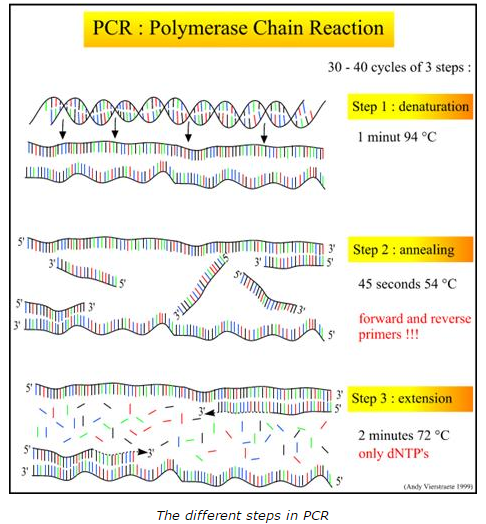 The template DNA's function is to copy a cell's DNA before it divides in two. The DNA polymerase that's most often used in PCR comes from a strain of bacteria called Thermus aquaticus that live in the hot springs of Yellowstone National Park. Primers are short pieces of DNA that are made in a laboratory and they are custom built to match to the segment of DNA you want to copy. Taq Polymerase allows the amplification of the short segments of DNA through its ability to withstand the high temperatures necessary for the PCR reaction. Deoxyribonucleotides or dNTP's allow the DNA strand to grow due to the nucleotide base they contribute. Both images attributed to:  http://missinglink.ucsf.edu/lm/molecularmethods/pcr.htm