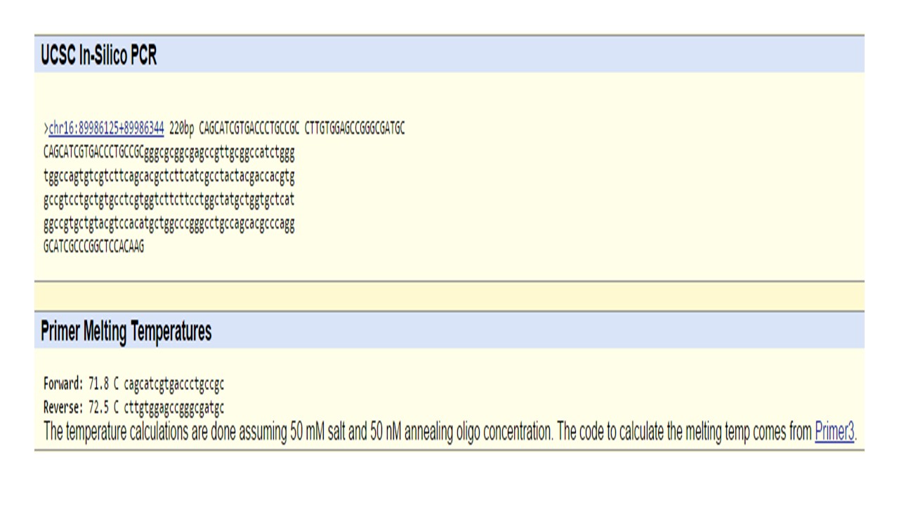 During which two steps of thermal cycling does base-pairing occur? In the steps of annealing and extension, the base pairing occurs. During the annealing process as the system is cooled, the target DNA binds with the short DNA primers that serve as guidance for the starting position for the replication to happen. When the temperature is slightly increased to 72 degrees in the extension phase, the Taq polymerase binds to the template DNA and begins adding nucleotides that are complementary to the initial strand forming the new strands of the desired DNA. SNP Information & Primer DesignBackground: About the Disease SNP A nucleotide is the basic building block of DNA. Polymorphism is the genetic variation in a species. This mutation is found in Homo Sapiens. The clinical significance of this is pathogenic. SNP is associated with the MC1R gene. Single nucleotide polymorphism is a change in a specific nucleotide. This change may or may not cause a problem for the individual with the trait. Most of the time single nucleotide polymorphism does not cause any genetic problems. While not often causing problems by themselves, they often cause vulnerabilities to diseases. Single nucleotide polymorphism is helpful by allowing people's genetic vulnerabilities to be determined. Primer Design and Testing There are two primers needed for a PCR reaction to amplify target DNA sequence. The first step in designing the primer for this experiment was to locate the non-disease allele CGG, each gene has two alleles inherited from each parent and these alleles have gene coding for the same trait, the disease is linked to the change at C position in the allele. This changed sequence associated with the disease is TGG. NCBI website was used to find the DNA sequence of the SNP and the sequence surrounding it. The numerical position of the SNP was found to be 89919736. After locating the exact numerical position of the SNP, the DNA bases could be read. Since the disease related SNP for this experiment is located on the top strand of DNA going from 5’ to 3’, the non-disease forward primer (5’ to 3’) is designed using the top strand going from left to right with a 20 base long sequence that ends at the nucleotide C which is the position of the SNP. The non-disease forward primer designed was 5’- CAGCATCGTGACCCCTGCCGC. The second primer needed for this PCR reaction is the non-disease reverse primer. To be able to design the second reverse primer the position 200 bases to the right of the position of the diseased SNP is located and that position is 89919936. The reverse primer is designed from the bottom reverse strand of the DNA. To design the primer the bottom DNA sequence is read from right to left and the bases for the reverse primer are arranged and written from left to right. The non-disease reverse primer designed was 5’-CTTGTGGAGCCGGGCGATGC. Next step for this experiment was to design a pair of disease SNP-specific primers. The whole process was the same except the final base C of the non-disease forward primer was replaced with the disease related base in this particular allele of the SNP. The disease forward primer designed was 5’-CAGCATCGTGACCCTGCCGT. The disease reverse primer designed was 5’- CTTGTGGAGCCGGGCGATGC. The UCSC In-Silico PCR website was used to check the validity of the primers. The non-disease forward and reverse primers were checked and the result came back 220 bp sequence from chromosome 16 related with this particular case indicating that the primers are valid. However, the result for the disease forward and reverse primers came back showing no matches. Since the primers were validated by using the UCSC In-Silico PCR website that only contains the non-disease human genome sequence, the match was not found for the disease specific primers. The screen shots of the results acquired are displayed below.