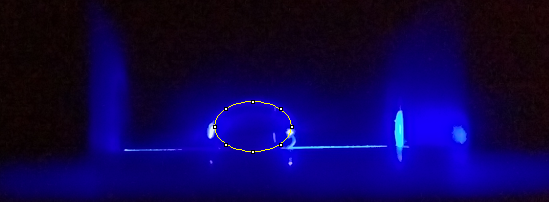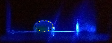 Place the smooth side of the slide downwardAfter setting the camera timer to three seconds, place it in the provided cradleChange the height of the fluorimeter to get a side view of the drop on the cameraIn the middle of the slide, put an eighty microliter drop of SYBR Green 1 upon the first two clear circles.Then, put an eighty microliter drop of the sample on this drop.Shift the slide so that the light shines through the drop, focusing the lightAfter adjusting the distance between the camera cradle and fluorimeter so that the images are close, yet focused, record this distancePlace the lightbox over the set up with one flap openSet the timer and close the flap before it captures the imagePlace the drop in the waster container after recording which sample was just picturedNext, slide the slide into the next position and repeat the experiment for all the possible slide posititons
