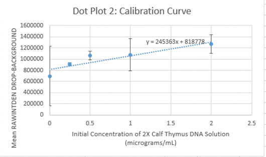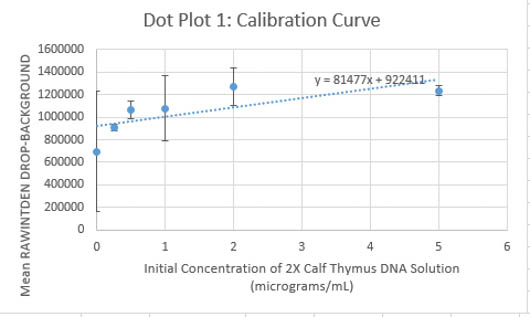 | Initial Concentration of 2X Calf Thymus DNA solution (micrograms/mL) | Final DNA concentration in SYBR Green I solution (µg/mL) | Sample Number | RAWINTDEN DROP - BACKGROUND: Image 1 | RAWINTDEN DROP - BACKGROUND: Image 2 | RAWINTDEN DROP - BACKGROUND: Image 3 | Mean | Standard Deviation |