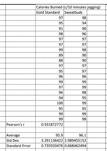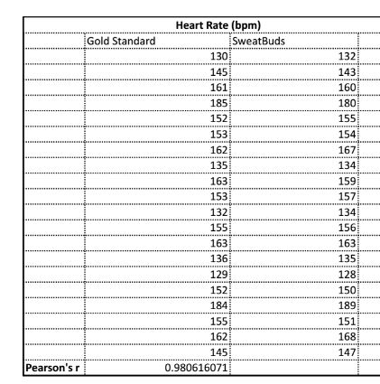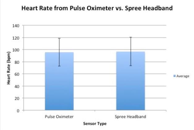 A paired t-test was used to compared the average heart rate measured by a pulse oximeter and the Spree Headband. A t-test was used because only two data sets were being compared. Since both sets of data were collected from the same group of people the t-test would be paired rather than unpaired. The p-value from the t-test of the data was 0.097819 and the Pearson's R correlation was 0.886903. Since the p-value was greater than 0.05 there was no significant difference between the gold standard and the Spree Headband for the heart rate readings.