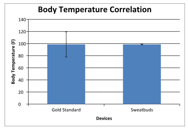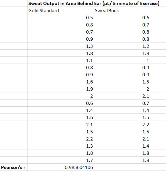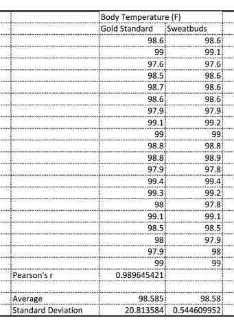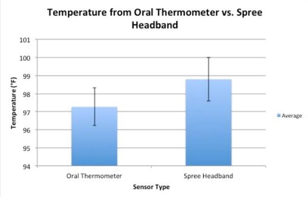 A paired t-test was used to compare the average temperature measured by a thermometer and the Spree Headband. A paired t-test was used because the data collected using both devices was taken from the same group of subjects. The p-value from the t-test of the data was 0.249655713 and the Pearson's R correlation was 6.91x10^-68, which is arbitrarily close to zero. The p-value was greater than 0.05 indicating that there was no significant difference between the gold standard and the Spree Headband for the temperature reading. The p-values for the temperature data and the heart rate data were both greater than zero indicating that there was some positive correlation between the type of device used and the measurement taken.