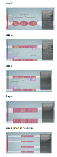 Step 1: Collect DNA that has been extracted from cells.Step 2: Move the DNA into a PCR tube.Step 3: Add Primer 1 to the PCR tube which will attach to sites on either end of the DNA strand segment.Step 4: Add Primer 2 which will attach to the second site on the DNA.Step 5: Add nucleotides to the PCR tube that will be used to create many DNA copies.Step 6: Add DNA Polymerase to the PCR tube which is used to read the DNA code and form a new DNA copy.Step 7: Place the PCR tube into a DNA Thermal Cycler.