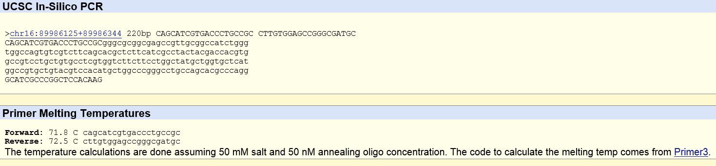 Primer Design and Testing The forward and reverse primers were found for both the disease and the non-disease variations. The forward primer for the non-disease variant was 5’- C A G C A T C G T G A C C C T G C C G C and the reverse primer was 5’ – C T T G T G G A G C C G G G C G A T G C. The forward primer for the disease variant was 5’ - C A G C A T C G T G A C C C T G C C G T which was identical to the non-disease variant, but with the last nucleic base C switched with a T, and the reverse primer was identical to the non-disease variant. After entering these into the non-disease genome sequencing website provided, the chromosome location result given was: chr16:89986125 for the non-disease variant and no results were returned for the disease variant. The chromosome location according to NCIB was chr16:89919736. It is not clear on what caused this minor difference. No mistake was found during troubleshooting and double checking. It is possible that this was a result of updated information.