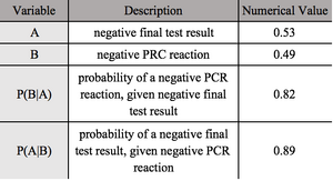 Calculation 1 shows that about 75% of patients that have a positive test result had a positive PCR reaction. THis means that 25% of people who have a positive test result could have a negative PCR reaction. The second calculation states that about 90% of people who have a negative final test result will have a negative PCR result this means that about 10% will have a negative final test result but a positive PCR result. Both calculations do not have to do with patients actually having the probability of getting the disease so patients should not be worried about these type of calculations.