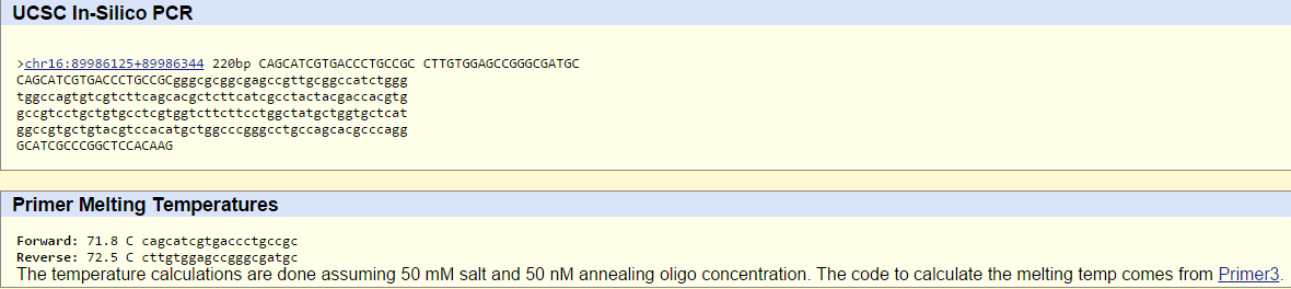 The non-disease forward primer is CAGCATCGTGACCCTGCCGC, which contains the "C" that would mutate to a "T" if it were an SNP. It is at numerical position 89919936. The non-disease reverse primer is CTTGTGGAGCCGGGCGATGC, which is 200bp to the right of numerical position 89919936. The disease forward primer is CAGCATCGTGACCCTGCCGT, which is identical to the non-disease forward primer except it contains the SNP ("C" to "T"). The disease reverse primer is CTTGTGGAGCCGGGCGATGC, which is 200 bp to the right of the SNP, identical to non-disease reverse primer.