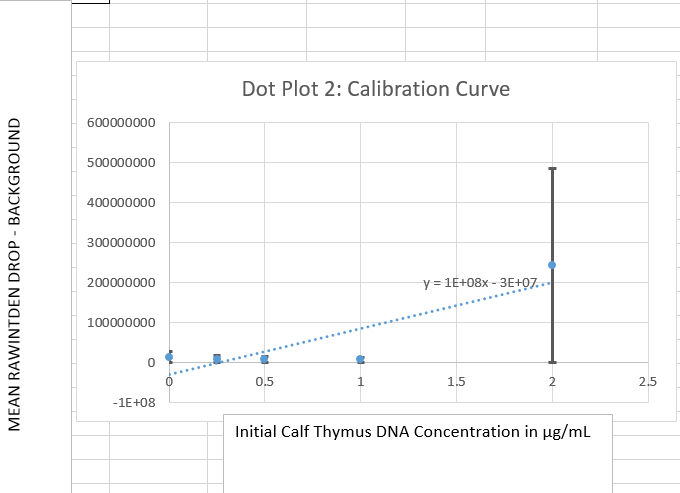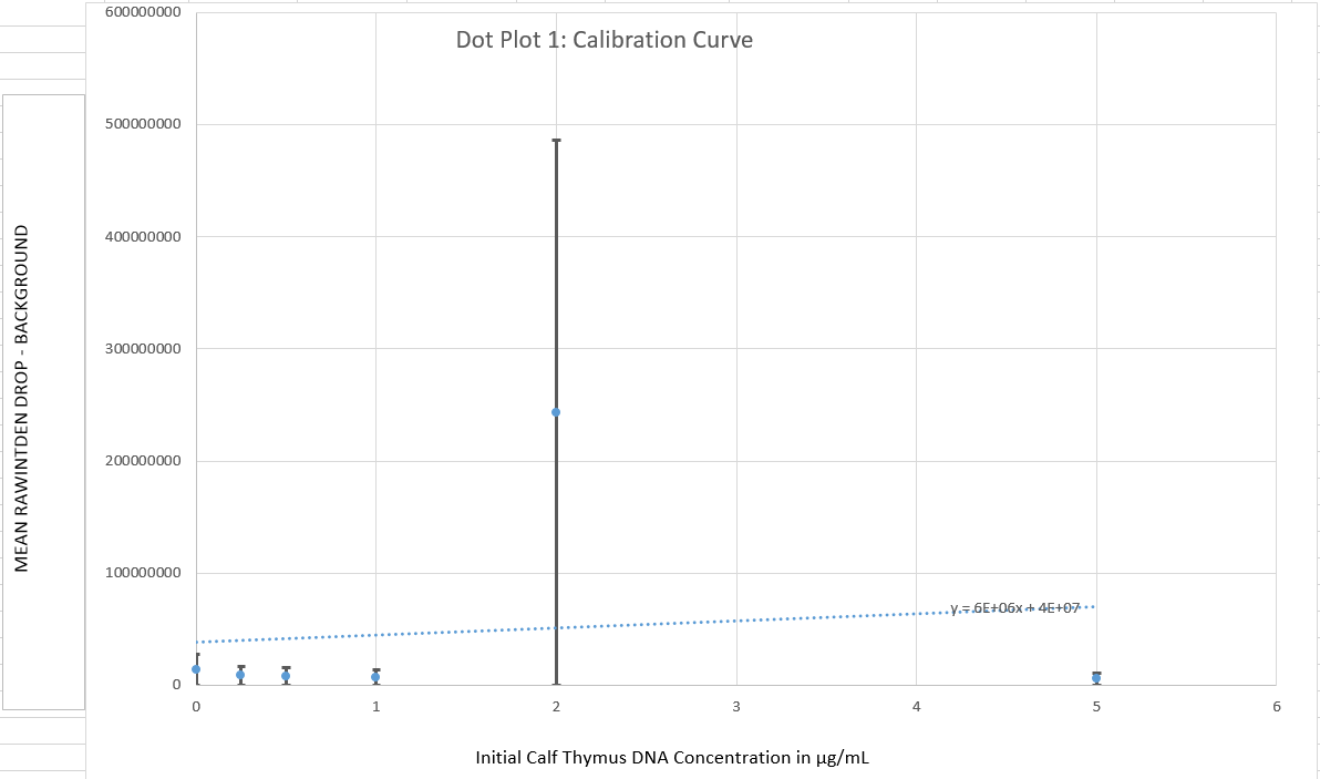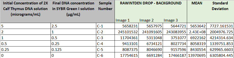 Set volume on pipettor to 80 microliters.Place slide into fluorimeter such that the holes that will be used are aligned with the blue LED light.Firmly attach tip to pipettor.Pipette 80 microliters of SYBR Green I onto one of the middle holes of the slide.Eject pipette tip into waste basket.Firmly attach another tip.Pipette 80 microliters of .25 concentration of the calf thymus into the hole right above the SYBR Green I.Use timer on camera to take pictures of the solution in the dark under the blue LED light.Dispose of the liquid on the slide into the liquid waste basket.Repeat steps for the .5, 1, 2, and 5 concentrations of the calf thymus.