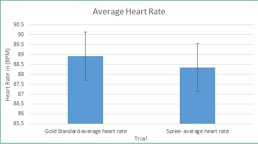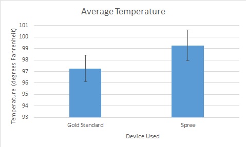 ResultsHeart Rate p-value: 0.390217623 Pearson's r correlation: 0.8233 Temperature p-value: 4.695E-77 Pearson's r correlation: 0.167425 The t-test was used for the comparison of the spree's temperature and the gold standard temperature, because there are only two groups being compared. The t-test was used for the comparison of the spree's heart rate and the gold standard heart rate, because there are only two groups being compared. The heart rate is not statistically significantly different because the p-value is higher than 0.05 at a value of 0.390217623.The Pearson's r correlation was 0.8233 showing that there is a positive correlation. However, the temperature readings are statistically significantly different, because the p-value is less than 0.05 with a value of 4.695E-77. The Pearson's r correlation was 0.167425 showing that there is not a correlation.