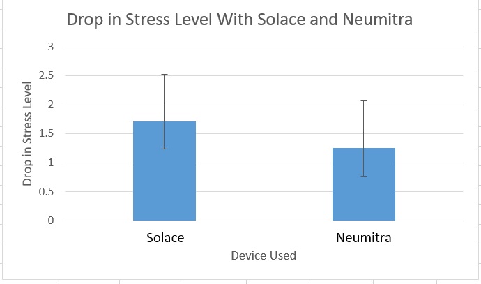 Inferential StatisticsGold Standard: Mean:1.7 Standard Deviation: 0.814411018 Standard Error: 0.115175111 Solace: Mean: 1.72 Standard Deviation: 0.809131558 Standard Error: 0.114428482 Neumitra: Mean: 1.26 Standard Deviation: 0.486973159 Standard Error: 0.068969404 T-Test: - Gold v. Solace: 0.902211501 - Gold vs. Neumitra: 0.001443479 Pearson: - Gold vs. Solace: 0.953875856 - Gold vs. Neumitra: 0.097770729 Our P-value indicates that our data is statistically significant and that there is a different between the drop in stress level in the Solace and Neumitra.