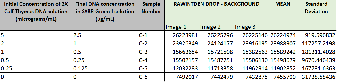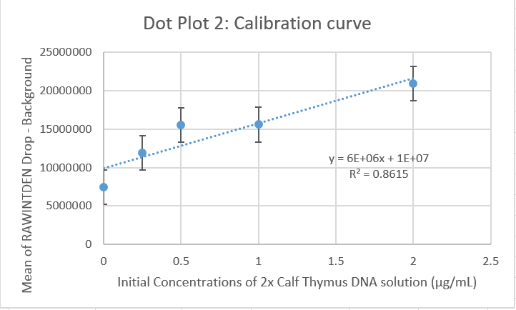 Note: The above table shows negative values for the concentration of DNA in the samples. The group is aware that this is not possible, and is due to a skewed relationship in the linear calibration from table 2. These negative values should actually be recorded as zero. However, for the sake of showing that the calculations were done correctly, they remain negative in the above graph.