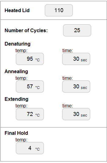 Research and DevelopmentPCR - The Underlying Technology A PCR reaction incorporates specific components to replicate DNA. We initially have a template DNA which has the specific portion of the DNA that we want to replicate. During the initial step of thermal cycling the temperature rises to 95°C were denature occurs, separating the double helix DNA into 2 separate single-standed DNA molecules. During the second step of the thermal cycling, anneal, the temperature changes to 57°C. During this portion of the PCR process, the primers attach to each end of the segment of DNA that is being copied, through a process known as base pairing. These segments are made up of specific Deoxyribonucleotides (A, T, C, and G) which have a complimentary ends. In the third step of thermal cycling, extend, temperature is brought to 72°C. At this temperature, the polymerase is activated and reads the DNA code. It then attaches the nucleotides to each of the single-stranded DNA molecules and creates two new strand of DNA. Once this step is completed, the substance is kept at 72°C for an extra three minutes to ensure that all the single stranded DNA molecules have fully extended. The substance can then be brought to 4°C to allow for short term storage.