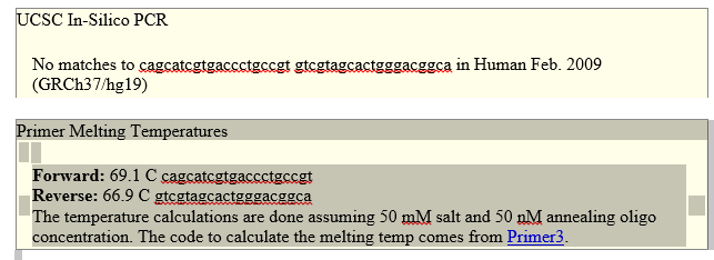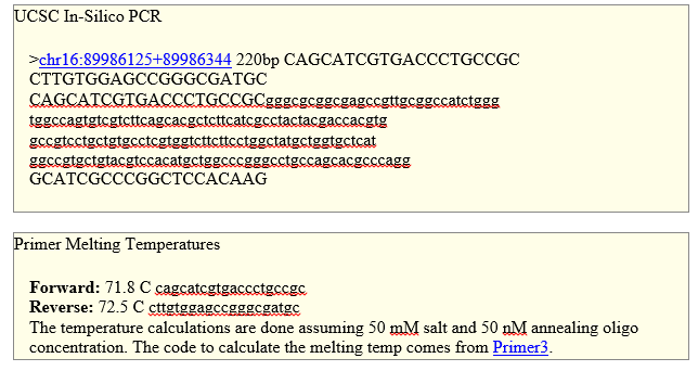 SNP Information & Primer DesignBackground: About the Disease SNP A single nucleotide polymorphism (SNP) is a single base pair difference in the nucleotide sequence between individuals of a given DNA sequence. SNP is pathogenic (disease causing). SNP is linked to being the cause of melanoma. The variation is found in Humans (Homo Sapiens). The chromosome that the variation is located on is 16:89919736 and the gene it is associated with is MC1R. MC1R stands for melanocortin 1 receptor (alpha melanocyte stimulating hormone receptor). MC1R functions include: G-protein coupled peptide receptor activity, hormone binding and melanocortin receptor activity. The non-disease allele contains CGG. A change in this allele, at the C position, is linked to the disease. The disease-associated allele contains the sequence TGG. The numerical position of the SNP is 89919736. Primer Design and Testing To design primer pairs for PCR. Every PCR reaction needs two primers to amplify DNA. First we designed the non-disease forward primer starting by writing down the sequence that is 20 bases long and ends with the nucleotide at the numerical position of the SNP (89919736). The non-disease forward primer found was 5’- CAGCATCGTGACCCTGCCGC. Next we designed a non-disease reverse primer by first moving 200 bases to the right of the numerical position of the SNP. The numerical position exactly 200 bases to the right of the disease SNP is: 89919936. The non-disease reverse primer was determined by the reverse strand of DNA reading from right to left, writing the bases left to right. The non-disease reverse primer found was 5’- CTTGTGGAGCCGGGCGATGC. We tested the designed non-disease primers using the UCSC In-Silco PCR website. The result we got was “220 bp” sequence from the chromosome which means our non-disease primers are correct. See attached image of test. Next, we design a pair of disease SNP-specific primers by changing the final base of the non-disease forward primer so that it is identical to the disease SNP base, and leave everything else the same. Our designed forward primer is 5’- CAGCATCGTGACCCTGCCGT and our disease reverse primer is 5’- GTCGTAGCACTGGGACGGCA. We then tested the designed disease primers using the UCSC In-Silco PCR website. The result we got was “No Matches”. This indicates that current known primers that can attach to DNA strands were not able to attach. Therefore we can conclude that this is a new disease. See attached image of test.