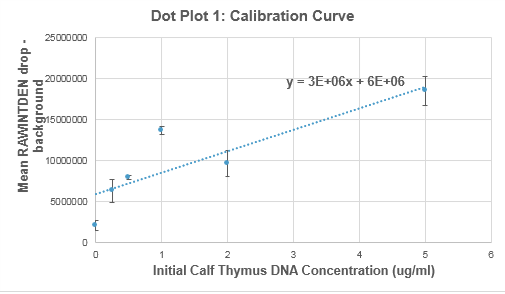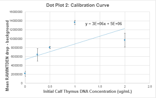 | Initial Concentration of 2X Calf Thymus DNA solution (micrograms/mL) | Final DNA concentration in SYBR Green I solution (µg/mL) | Sample Number | RAWINTDEN DROP - BACKGROUND | ' | ' | MEAN | Standard Deviation |