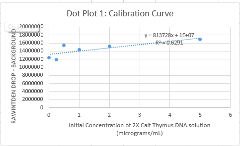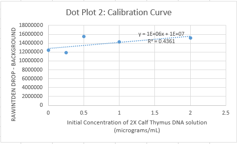 | Initial Concentration of 2X Calf Thymus DNA solution (micrograms/mL) | Final DNA concentration in SYBR Green I solution (µg/mL) | Sample Number | RAWINTDEN DROP - BACKGROUND | ' | ' | Mean | Standard Deviation |