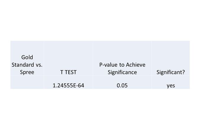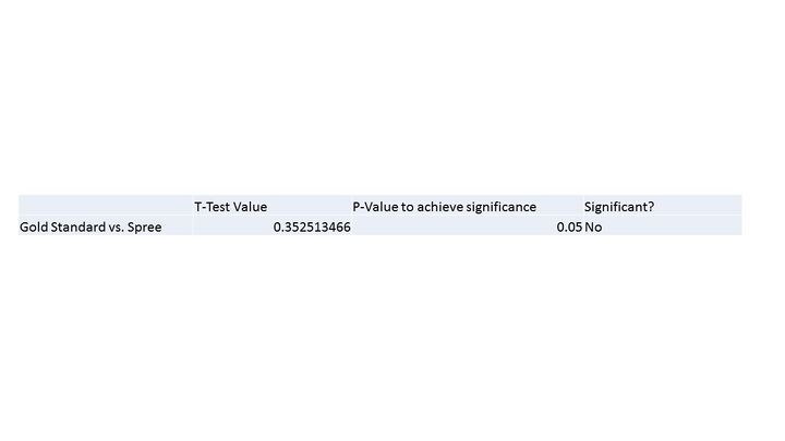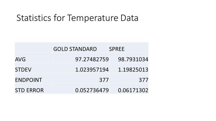 AnalysisPearson's R correlation for the difference of heart rate when measured by gold standard and Spree was calculated to be 0.633018213. The definition of this concept involves the strength of the linear association between two variables. This value, denoted by r, shows that there is not a strong correlation between the data and thus the results are not significant enough to prove the strength of the Spree as a heart rate sensor. The closer the r value is to 1 the stronger the association between the two variables. A t-test was conducted for the heart rate study between the two devices because there were only 2 groups to compare. The results were paired based on the fact that the samples were related as the same subject was constantly being tested. The p-value for this test was 0.352513466, and because this value is so high when compared to the p-value (0.05) to achieve significance, the data was determined to not be significant. Because the p value was determined to be greater than the five percent level of significance conducted in the experiment and the Pearson's R correlation was found to be 0.633018213, there was not enough power to prove that the Spree was accurate compared to the Gold Standard. Pearson's R correlation for the difference in temperature when measured by the gold standard and Spree was calculated to be 0.196248713. This means that the two variables were not very closely associated with each other. For two groups to be considered strongly correlated with each other the r-value should be very close to 1. The p-value found from the comparison of these two groups suggests that the spree band was very inaccurate and measuring temperature. A t-test was also conducted for the temperature data from the spree band and the gold standard. The t-test showed that there was a significant difference in the two groups, which is understandable based on the spree bands method of temperature tracking. Over all the temperature data was not considered significant because it was measured using a 1-4 level system that did not read an actual temperature in degrees, leaving the values of the spree band to be assumptions instead of actual measurements.