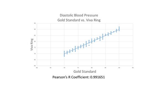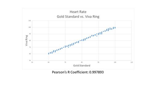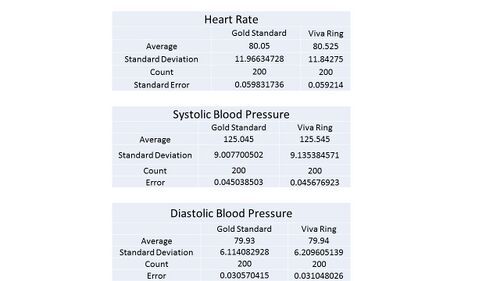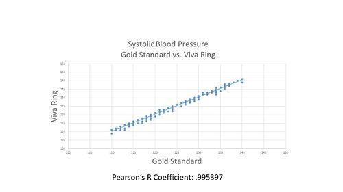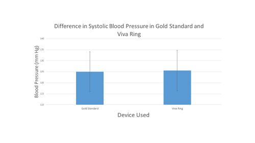 GraphBecause two similar groups were being compared, a paired t-test was conducted for the difference in heart rate between the gold standard and the Viva Ring. The p-value for this paired t-test was 0.690105843. Because this value is greater than .05, the two groups were not significantly different from each other. Because two similar groups were being compared, a paired t-test was conducted for the difference in systolic blood pressure between the gold standard and the Viva Ring. The p-value for this paired t-test was 0.581832904. Because this value is greater than .05, the two groups were not significantly different from each other. Because two similar groups were being compared, a paired t-test was conducted for the difference in diastolic blood pressure between the gold standard and the Viva Ring. The p-value for this paired t-test was 0.987060294. Because this value is greater than .05, the two groups were not significantly different from each other.