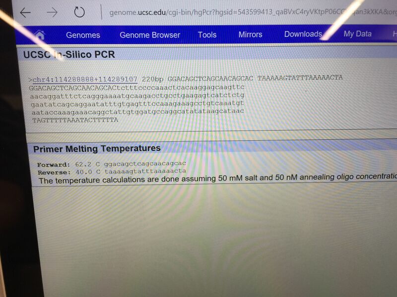 The National Center for Biotechnology website was used as a reference for this portion of the lab. The Single Nucleotide Polymorphism that was of interest in this case was labeled as rs35530544 and is a missense in the genetic sequence causing clinical pathology. The numerical position of this SNP was recorded and the forward 5’ sequence was copied from the SNP position to 20 nucleotides to the right. The diseased nucleotide was replaced with the non-diseased version to create our Non-Diseased Forward Primer. Jumping over 200 base positions to the right, we followed the same process starting on the reverse 3’ strand and recorded 20 nucleotides over. This became our Non-Disease Reverse Primer. On the UCSC In-Silico PCR website, we tested both our non-disease primers in the genome database and they worked with 220 base-pair sequences on our targeted chromosome.