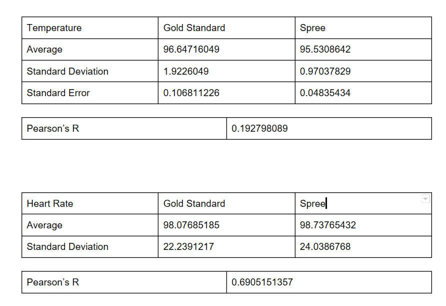 Inferential StatsBased on the data obtained through the two tailed tests, it can be confirmed that the spree did not relay accurate information when it tested the temperature of the subjects. Although the average values were similar, the variance between the data were off by nearly 96%. This can further be proven when comparing the p-value obtained from the temperature data chart, which was p=0.01, to the known p-value of p=0.05. Because the measured p-value was 16% lower than the known value, the spree's data is known to be unreliable. The data obtained from measuring the heart rate, however, was extremely accurate. The compared p-value is p=0.72, and since it is more than 5%, it shows that the spree is capable of relaying accurate information in terms of heart rate. When analyzing the graphs, the similarity between the spree and the gold-standard become more apparent, considering the averages and the standard deviations are nearly identical.
