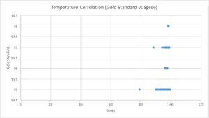 Based on the data, it can be concluded that when measuring temperature, the Spree device was very inaccurate as opposed to the gold standard. As shown by the calculated Pearson’s Correlation Coefficient of 0.19 which is relatively close to 0, it can be concluded that there is little to no correlation between the gold standard measurements and the Spree headband as shown by no linear trend between both measurements. Furthermore, through analyzing the P-Value through conducting a t-test, with a result of 1.85E-20, it can be understood that there is a significant difference between the measurements of the Spree headband and the gold standard, showing that the Spree headband is not capable of accurately measuring temperature.