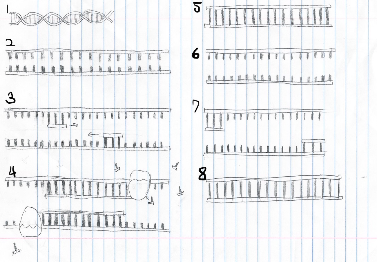 1. This picture is simply the initial state of the template DNA that still needs to be shortened. 2. The DNA was heated up, so the double helix unraveled and the ends separated. 3. The primers attached to the desired regions of the DNA on opposite ends. 4. DNA Polymerase attaches to the primers and takes the nucleotides floating around and attaches them onto the DNA 5. The process has created a very small amount of the desired strand and it must be continued. What is not shown is that the desired strand of DNA is not yet present until another cycle is done. 6. The solution is heated once again and the strands separate. 7. The primers attach once again as it is cooled down 8. The DNA Polymerase attached to the separate ends and replicated the DNA. This is when the desired strand of DNA is finally present, so steps 4-8 can be repeated as may times as needed.