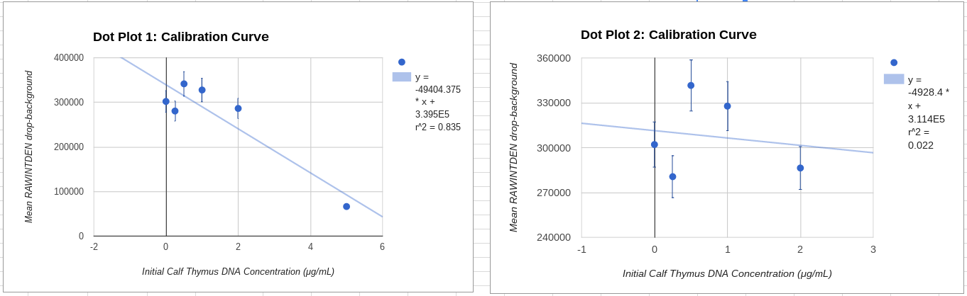 Placing Samples onto the Fluorimeter It should first be noted that all of the drops must be placed on a fluorimeter slide. In order to ensure that proper bubbles are formed, the rough side of the slide should be the side facing upwards. Beginning with the SYBR GREEN 1 solution, we added 80 uL to the rough side of the slide. Following this, 80 uL of H2O were added right on top of the SYBR GREEN 1 solution. This gave us a clear bubble which we could analyze. The blue LED light was then turned on. Adjustments were made to make sure that the light went directly through the middle of the solution bubble. The box was lowered to cover the fluorimeter to allow for proper lighting, after which 3 separate images were taken of the solution bubble. This process was repeated for all of the Calf Thymus DNA concentrations, as well as the PCR DNA mix from the previous lab.