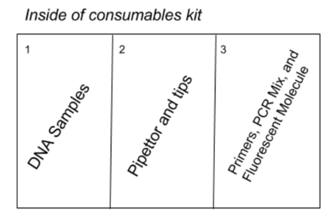 Feature 1: ConsumablesOur consumables kit will only include items that require specialized precision or cannot be commonly obtained in order to do the PCR reaction. Our kit also does not include basic safety equipment such as a lab coat, googles, or gloves because those are assumed precautions in lab procedure and would likely be followed by someone wishing to conduct an experiment of this caliber. Our consumables kit will include all tubes, pipettor tips, pipettors, PCR mix, and primers. Each consumable will be clearly labeled. All the pipettor tips will be biodegradable to make our consumables more eco-friendly. Other items that were needed in our original lab such as a black box or phone camera are already integrated in our improved real-time PCR machine. In addition, the box itself will be arranged in procedural order to make it more intuitive--in other words, the materials will be placed in the box in the order that they need will be used to make the PCR reaction. The procedure for preparing PCR reactions is to (1) first select the desired DNA to be placed into the empty tubes to be tested, (2) then to load pipettor tips onto the pipettor, and finally (3) to use the pipettor to insert the primers, PCR mix, and fluorescent molecule into the DNA sample. Thus, the box will be arranged in three sections: