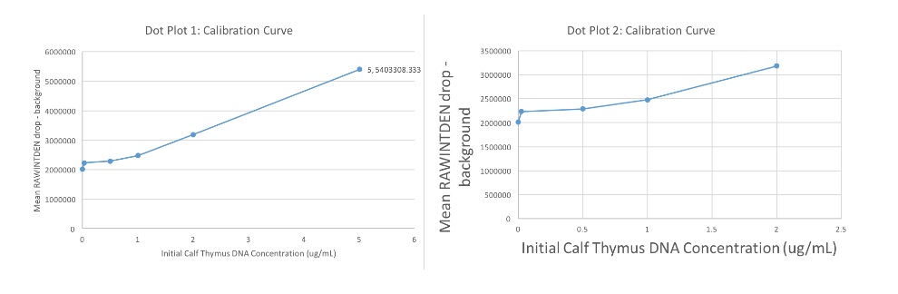 | Initial Concentration of 2X Calf Thymus DNA solution (micrograms/mL) | Final DNA concentration in SYBR Green I solution (µg/mL) | Sample Number | RAWINTDEN DROP - BACKGROUND (Image 1) | RAWINTDEN DROP - BACKGROUND (Image 2) | RAWINTDEN DROP - BACKGROUND (Image 3) | Mean | Standard Deviation |