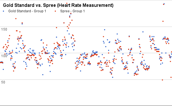 When comparing the pulse ox and spree band, the r-value is .68806. This means that there is a very strong positive correlation between the two. The t-test has a value of .421816, meaning that the values are significantly similar. Therefore, the spree band does do a good job of providing data.