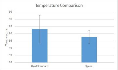 Regarding the Pearson's R for both tests, the graph showing the relationship between pulse ox of the gold standard and the headband came out to be .4661, this means that there is a slight correlation between the gold standard and the Spree Headband data. For the temperature tests, the Pearson's R came out to be .0003, or in other words, there was no correlation between the gold standard and the headband data.