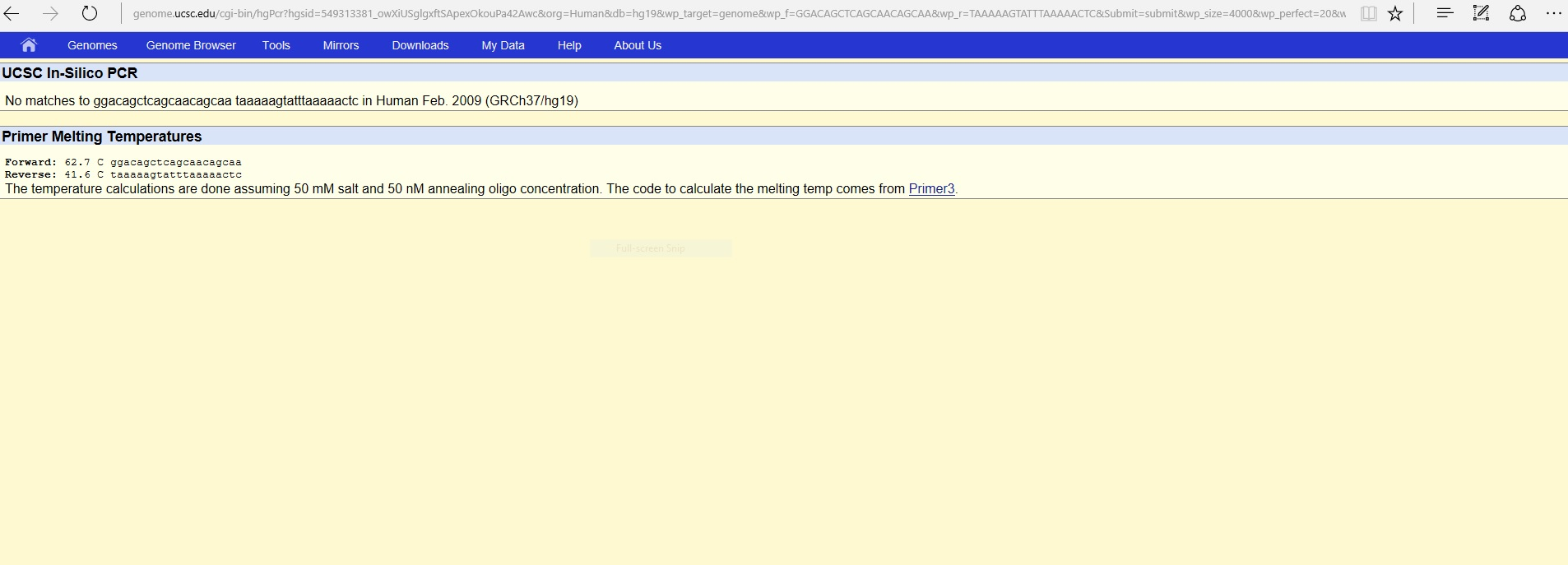 After run the primer sequence with reverse primer sequence in UCSC website we were able to get result 220bp which means our primers are correct. once we run mutation primers we found result no matches because web site database has only actual DNA sequences, not the mutation or disease sequences.