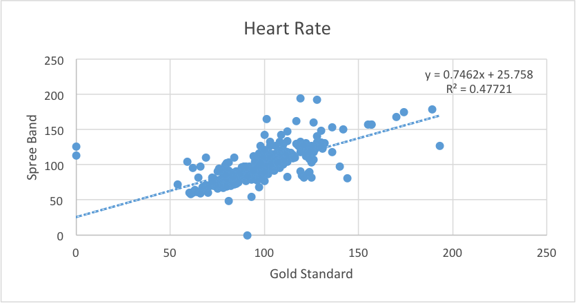 Heart Rate (Spree vs. Gold Standard): p-value (paired t-test): 0.427116193 This p-value is greater than 0.05, which shows that there is no statistical difference between the two means between the heart rate readings of the Spree Band and the Gold Standard (pulse ox). This means that the Spree Band's heart rate monitor is effective and accurate in its measurements of an individual's temperature, as the p-value signifies that there is no statistical difference between the two means, and the heart rate readings between the Spree Band are very close to the actual readings of the Gold Standard. Pearson's R Correlation Coefficient: 0.690806489 ANOVA p-value (disregard since not a 3 or more test): 0.661777944