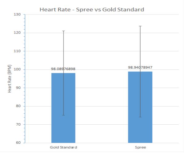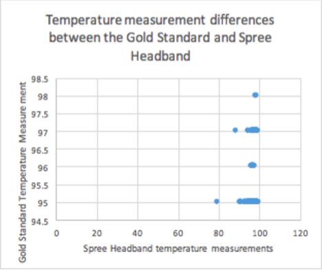 Compared to the Gold Standard of temperature measurement the Spree has very poor performance. Looking at the data there is a significant difference between the mean and the standard deviations. When the Spree headband was plotted against the gold standard of taking body temperature on a scatter plot there was almost no correlation with the Pearson correlation coefficient being about 0.1928 which being close to zero means there is no correlation between the Spree Headband and the gold standard. When the two-tailed T-test was performed the value we got was extremely small on the order of 10-21, which shows that the Spree Headband took very poor body temperature measurements. With the data that we analyzed we came to the conclusion that the Spree headband should not be used to take body temperature readings because it simply does not take measurements with any accuracy regardless of the activity type, be it resting or during some type of exercise.