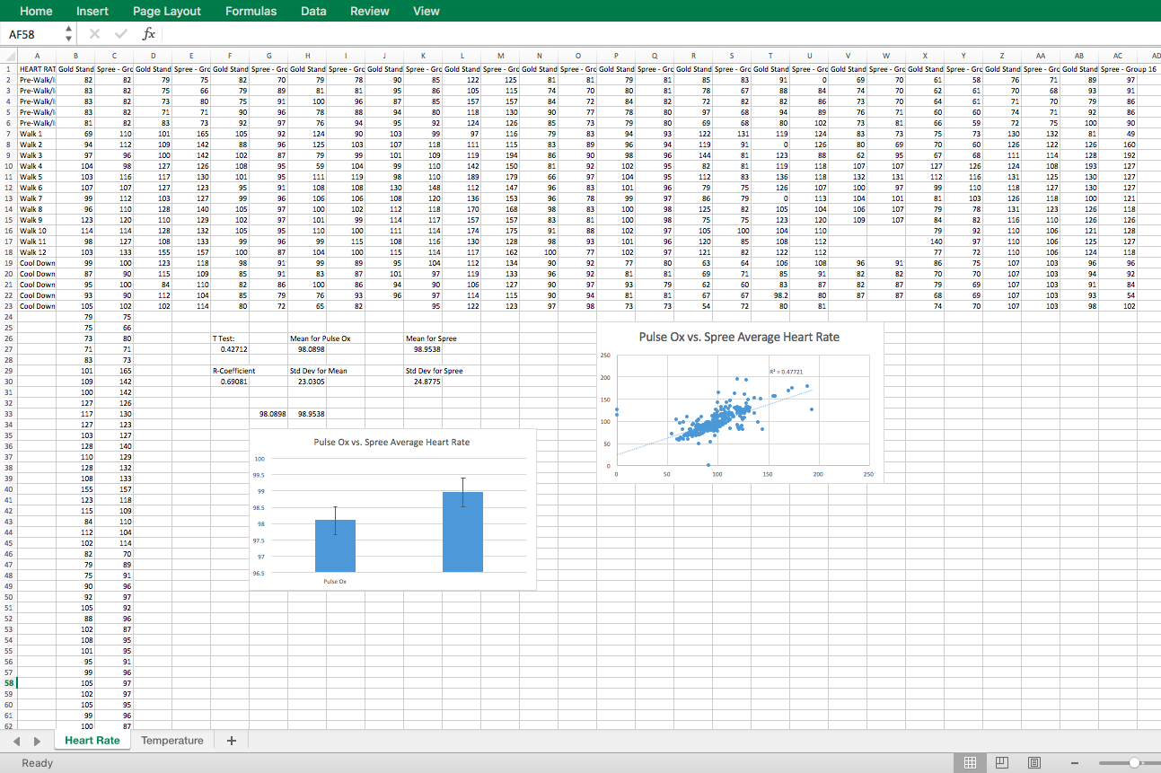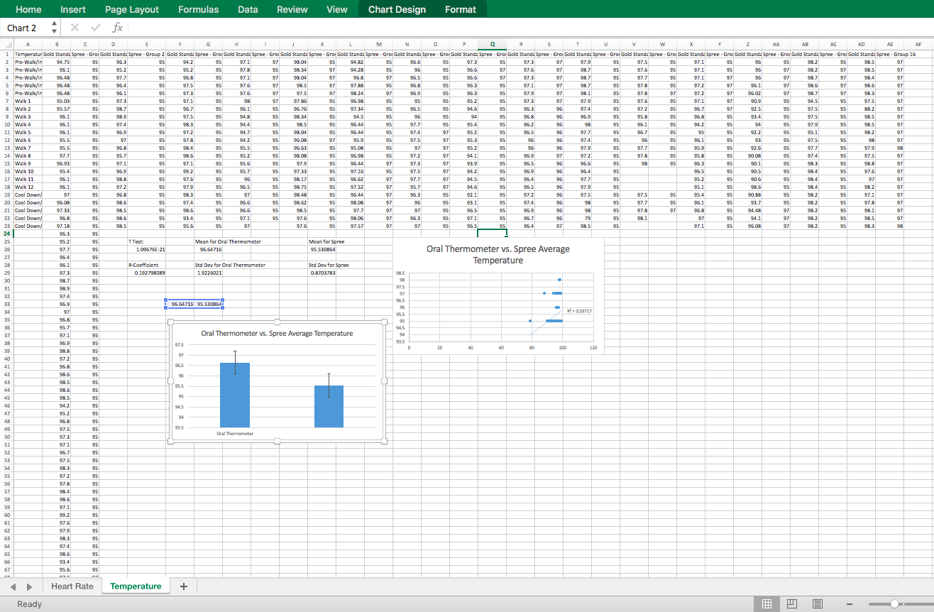 We did the same calculations for temperature as well, this time using an oral thermometer for the gold standard. For the mean of the results from the oral thermometer, we got 96.64716 and for the mean for the Spree, we got 95.530864. The standard deviations were 1.9226021 and .8703783 for the oral thermometer and the Spree headband, respectively. The R coefficient this time was very low at a value of .192798089. This suggests very little correlation between the oral thermometer results and the Spree headband results and this can be verified with our scatter plot. Lastly, our t-test results gave a p value of 1.09676*10^-21. This number is far, far below .05 which is a terrible thing in this experiment as it implies that there is a statistically significant difference between the oral thermometer and the Spree headband. Furthermore, the Spree headband is not good at measuring temperature as it differs too greatly from the gold standard.