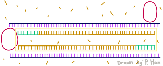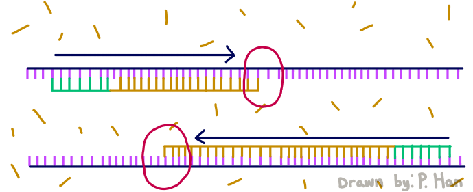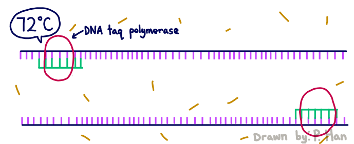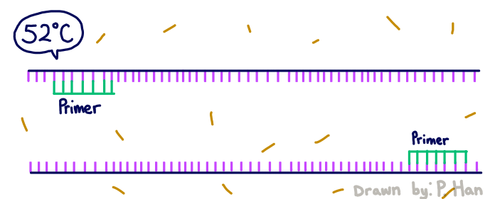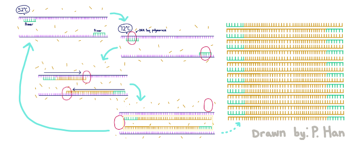 HEATED LID: 100°C Denature at 95°C for 30 seconds, Anneal at 57°C for 30 seconds, and extend at 72°C for 30 seconds FINAL STEP: 72°C for 2 minutes PCR, short for Polymerase Chain Reaction, is a method used by scientists to replicate and amplify the specific region of DNA that is of interest. PCR is done by adding primers to the DNA and repeatedly heating and cooling the mixture which has the effect of simulating the temperatures that are necessary for DNA replication to occur. The first step is for the temperature to go up to 95 degrees Celsius for 30 seconds so that the DNA “denatures,” or splits from its double-stranded form into single strands. After this step, the temperature goes back down to 57 degrees Celsius for 30 seconds which allows the primers to bind to the strands. Then the temperature goes back up slightly to 72 degrees Celsius for 30 seconds so that the enzyme DNA Taq polymerase can attach to the primed sequences and add nucleotides. This is the first cycle and the PCR will happen for 25 cycles in total.