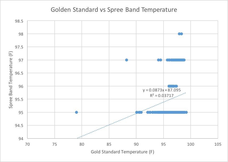 Design Flaws and RecommendationsSince the Pearson’s Correlation value is 0.6908 for heart rate, there is a strong correlation between the Spree band measurements and the golden standard measurements. However, since the t-test value is at 0.4271, it also means that the experiment is likely to produce different results if it were to be performed again. In summary, the Spree band is good enough to approximate heart rate, but would need additional testing with a larger sample size. Since the Pearson’s Correlation value is 0.1928 for body temperature, there is a weak correlation between the Spree band measurements and the golden standard measurements. Although the t-test value of 1.0968 E-21 shows that the results are highly reproducible, the Spree band lacks the ability to accurately measure body temperature. This can only be improved by changing the sensors in the device.