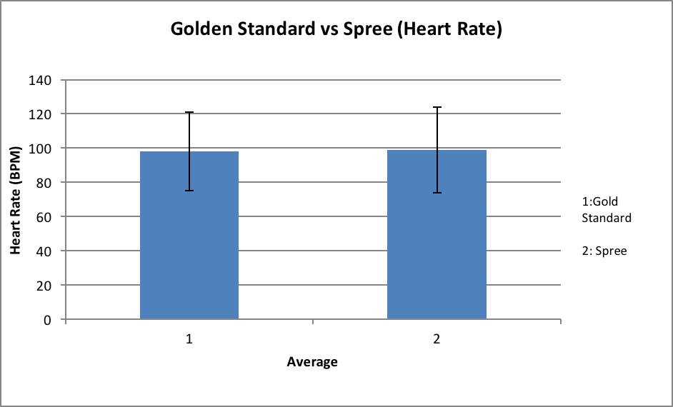 Design Flaws and RecommendationsWhen comparing the results of the temperature readings, the mean values seem as though the Spree headband and oral thermometer are equal, however upon closer examination the Pearson's R coefficient for the test is 0.19287, meaning that the correlation between the Spree headband and oral thermometer exists but since the number is so small, the correlation is weak. The t-test for this experiment is: 1.097E-21, and since that number is much smaller than the 0.05 p-value number, the difference between the two groups is significant. Overall, this shows the Spree headband needs to be reevaluated before it can be a real competitor with the gold standard. The Spree headband needs to be more precise, similar to the gold standard, for example none of the numbers measured with the Spree headband have decimal recordings.  When comparing the results of the heart rate readings, the mean values are calculated to be extremely similar, and the p-value from the t-test is calculated to be 0.427116 which shows that the data is not significantly different since It was greater than 0.05. The Pearson's R coefficient came out to be 0.690806 which indicates a relatively strong correlation. Overall, the Spree headband would be an accurate tool for measuring heart rate.