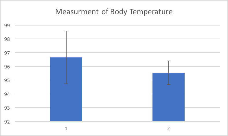 Inferential StatsThe inferential statistic that would most fit the data would be the t-test, due to the fact that only two groups are being compared. If multiple groups were being compared, a different method of inferential statistics would be explored. The t-test value for the Spree headband and the oral thermometer is: 1.09676E-21. The t-test value for the Spree headband and the pulse ox gold standard is: 0.427116.