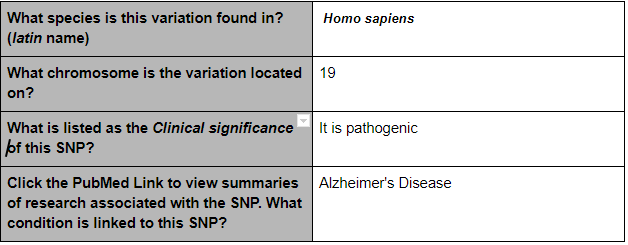 The SNP variation is found in the species of homo sapiens and on chromosome 19. If is a pathogenic and Alzheimer’s Disease is linked to this particular SNP. An allele is one of two or more alternative forms of a gene that arise from a mutation, located at the same place on a chromosome. With this disease, CTG changes to CCG.