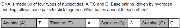 Adenine (A) and Thymine (T) bond together and Cytosine (C) and Guanine (G) bond together. Base pairing occurs during the annealing and extending stage. During the Annealing stage, primers bind to a specific location on the DNA template. These primers are complementary, meaning the nucleotides in the primer match. The next stage, Extending, is where the new DNA is made by Taq DNA polymerase enzymes. These enzymes are what add the majority of DNA bases which are paired off.