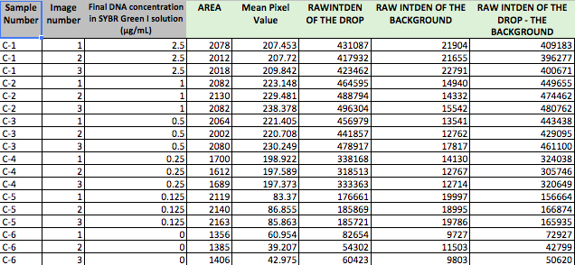| Initial Concentration of 2X Calf Thymus DNA solution (µg/mL) | Final Concentration DNA concentration in SYBR Green I solution (µg/mL) | Sample # | RAWINTDEN DROP-BACK: Image 1 | RAWINTDEN DROP-BACK: Image 2 | RAWINTDEN DROP-BACK: Image 3 | MEAN | Standard Deviation |