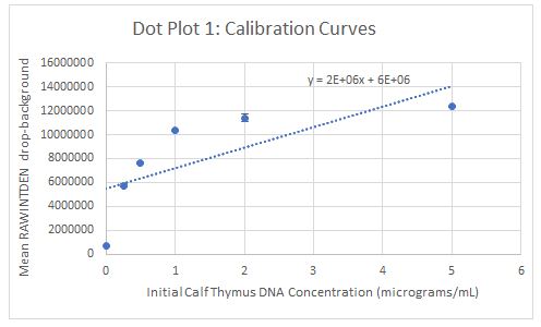 | Initial Concentration of 2X Calf Thymus DNA solution (micrograms/mL) | Final DNA concentration in SYBR Green I solution (µg/mL) | Sample Number | RAWINTDEN DROP - BACKGROUND | MEAN | Standard Deviation |