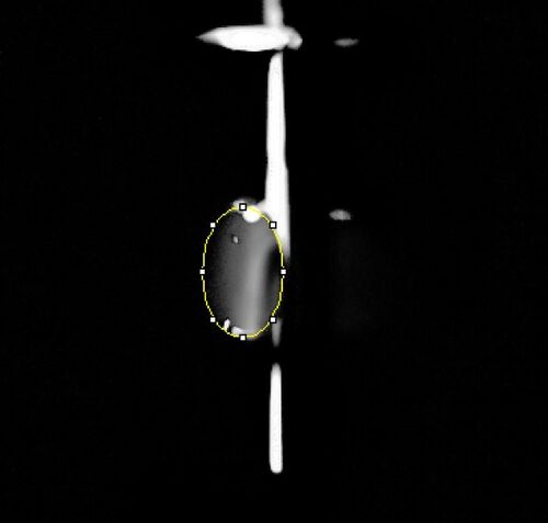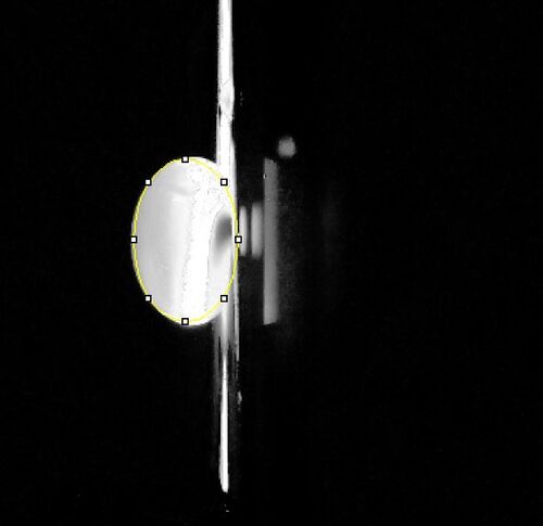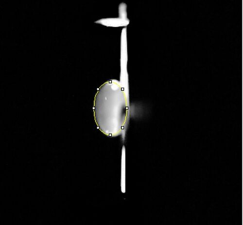We placed a 160μL drop of water in the middle of the first two rows of slides using a pipettor in such a way that the drop is pinned and looks like a beach ball. Then a blue LED was turned on to function as an excitation light. The camera was placed in a cradle at a right angle from the drop, and a fluorimeter was adjusted so the camera was able to take a sideways photo of the drop. The camera was then adjusted to be as close as possible while still retaining a clear image; this distance was recorded in cm.