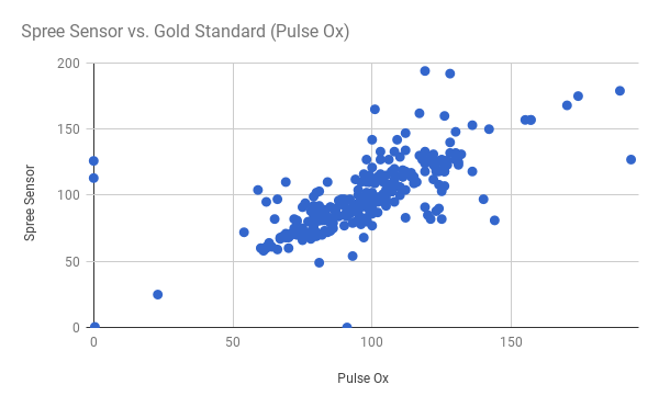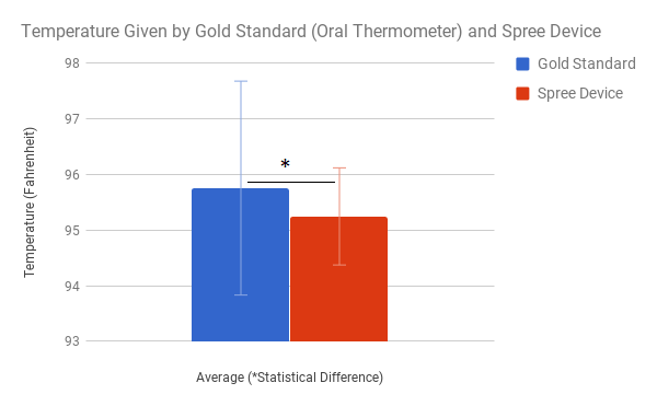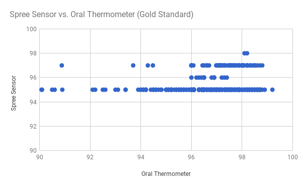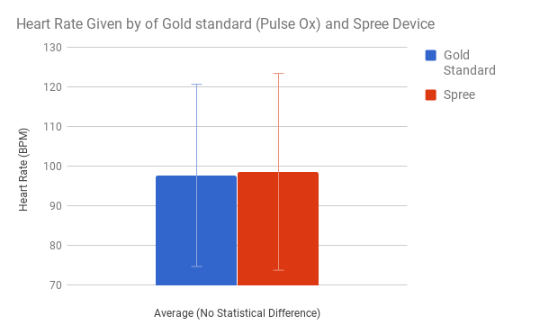 Inferential StatsUsing the means and standard deviations for 1) the Spree Sensor for both heart rate and temperature, 2) Pulse ox (gold standard) and 3) oral thermometer (gold standard), a paired t-test to compare both the Spree Sensor to the pulse ox and the Spree Sensor to the oral thermometer was run and interpreted below. Spree Sensor vs. Pulse Ox paired t-test value: p = 0.427116 Spree Sensor vs. Oral Thermometer paired t-test value: p = 4.98*10^-21 (<<<0) Analysis When comparing the Spree Sensor to the pulse ox, it can be stated that there is not enough evidence to reject the null hypothesis, where the difference of the means of the Spree Sensor and pulse ox is equal to zero. This is because the p-value calculated by the paired t-test is much greater than 0.05, and that indicates that there is a high probability of no difference between the two devices. Therefore, the Spree Sensor adequately measures heart rate with very similar accuracy to that of the pulse ox (gold standard). This strong relationship between the two devices and their measurements at the same time intervals is verified with the correlation coefficient r=0.6908064894, which indicates a fairly strong, positive correlation between the measurements for the Spree Sensor and the measurements for the oral thermometer (gold standard). When comparing the Spree Sensor to the oral thermometer, the p-value obtained from the paired t-test was 4.98*10^-21, which is very very small and less than 0.05. Therefore, there is an extremely low probability that the difference between the means of temperature data calculated from both the Spree Band and the oral thermometer is equal to zero; there is sufficient evidence to reject the null hypothesis that this difference is equal to zero. From this paired t-test, it was determined that there is a significant difference in temperature readings from the two devices. This inconsistency between the two devices is also seen by a very small correlation coefficient r= 0.1745355645, indicating a weak relationship between the measurements of both devices at the same time intervals.