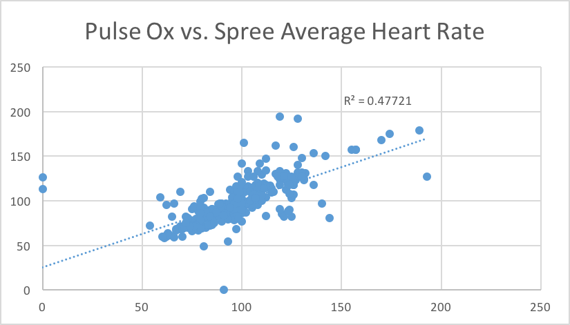 LAB 3 WRITE-UPDescriptive Stats and GraphPulse Ox vs. Spree Band -Gold Standard Mean--Pulse Ox Device: 98.09 -Spree Band Mean: 98.95 -Gold Standard Standard Deviation--Pulse Ox Device: 23.03 -Spree Band Standard Deviation: 24.88 -Pearson "R" Value: 0.6908