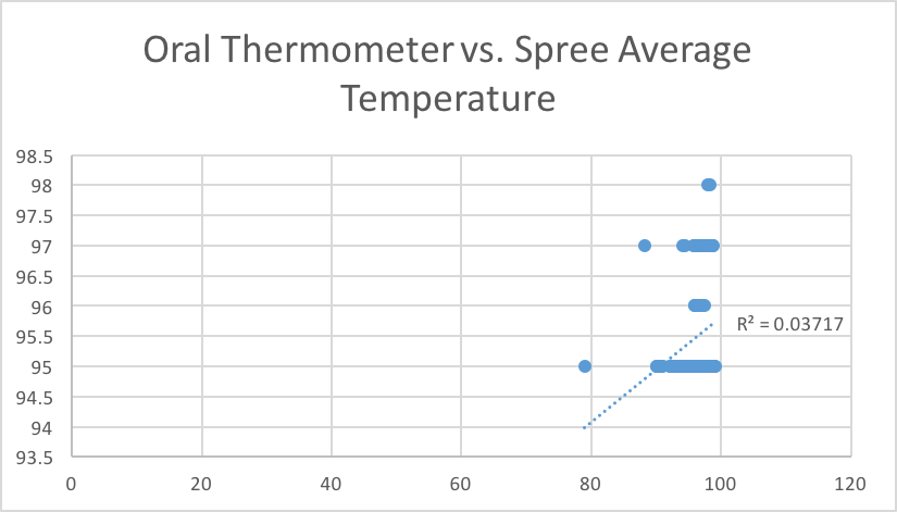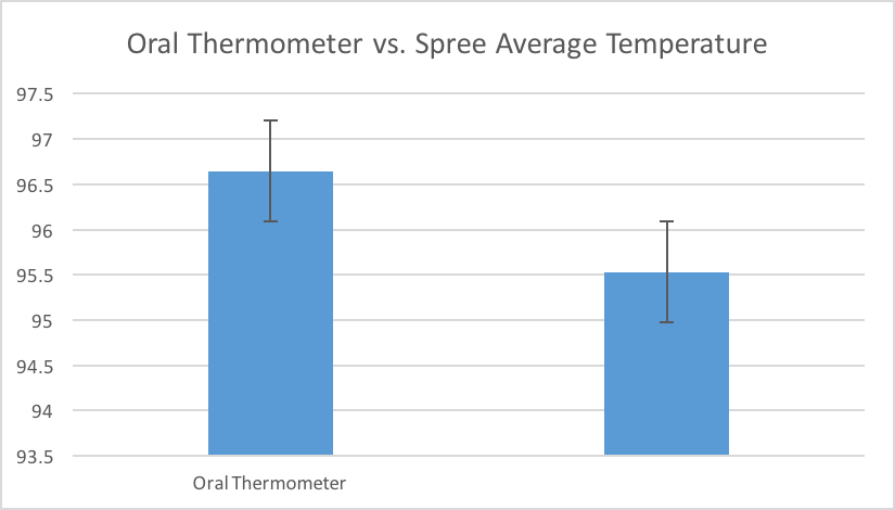 -Gold Standard Mean--Oral Thermometer Device: 96.66 -Spree Band Mean: 95.53 -Gold Standard Standard Deviation--Oral Thermometer Device: 1.922 -Spree Band Standard Deviation: 0.8704 -Pearson "R" Value: 0.1928