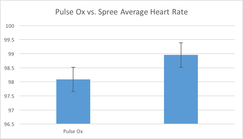 Inferential StatsPulse Ox vs. Spree Band A paired, two-tailed t-test was used to calculate the p-value (0.4271) of the data. After calculating the p-value for heart rate from the given data, a number greater than 0.05 was recorded, meaning that there is no significant statistical difference between the Gold Standard Data and the Spree data. Because of this, the correlation between the data is comparable for heart rate. Oral Thermometer vs. Spree Band A paired, two-tailed t-test was used to calculate the p-value (1.097E-21) of the data. After calculating the p-value for temperature from the given data, a number significantly less than 0.05 was recorded, meaning that there is a significant statistical difference between the Gold Standard Data and the Spree data. Because of this statistical difference, the correlation between the data is not comparable for temperature.