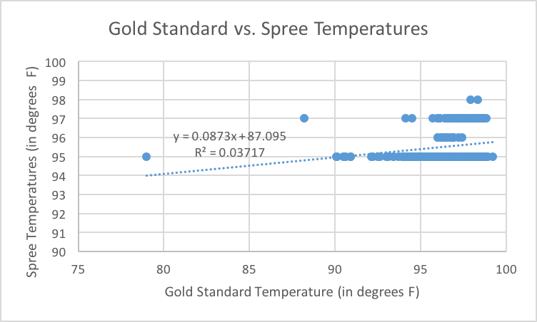 LAB 3 WRITE-UPDescriptive Stats and GraphHeart Rate: Gold Standard Mean: 98.08976898 Gold Standard Standard Deviation: 23.03054395 Spree Mean: 98.95379538 Spree Standard Deviation: 24.97753802 Pearson r Value: 0.690806489 Temperature: Gold Standard Mean: 96.647 Gold Standard Std. Deviation: 1.9226 Spree Mean: 95.531 Spree Standard Deviation: 0.87038 Pearson r value: 0.19280
